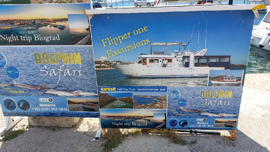 Pakoštane-ban a templommal szemben a központban lévő mólóról indul deflinnéző hajó a reggeli órákban. Érdemes megvenni a jegyet egy két nappal a kiválasztott indulási időpont előtt, főleg főszezoban amikor ebben a régióban igen megnövekszik a túristaforgalom. Általában az esti órákban vannak ott.